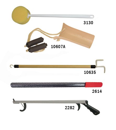Includes - Formed sock aid, EZ metal shoe horn, 32" reacher, dressing stick, long handle sponge.