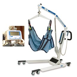 The lift and transfer is the traditional style, portable lift constructed of heavy-duty steel. The easy rolling casters, two locking in the back and four swivel in the front, allows for positioning into various locations. The lift is operated by a four-button hand control and a linear driven actuator that is virtually silent. For added safety the emergency release allows the individual to be lowered when battery power is interrupted. Automatic based width adjustability. Two easy weight lift adjustment settings. Battery powered with internal charger. Dimensions: - Base width: 29.5"- 53" - Base length: 61.5" - Base clearance: 4.75" - Lift height: 34"- 75" (from the clevis pin to floor) - Weight capacity: 750 lbs. or 1000 lbs. Slings: XL - 48"W (top) x 50"W (bottom) x 50"L, 750 lbs. - 1,000 lbs. weight capacity L - 46"W (top) x 48"W (bottom) x 48"L, 600 lbs. - 750 lbs. weight capacity